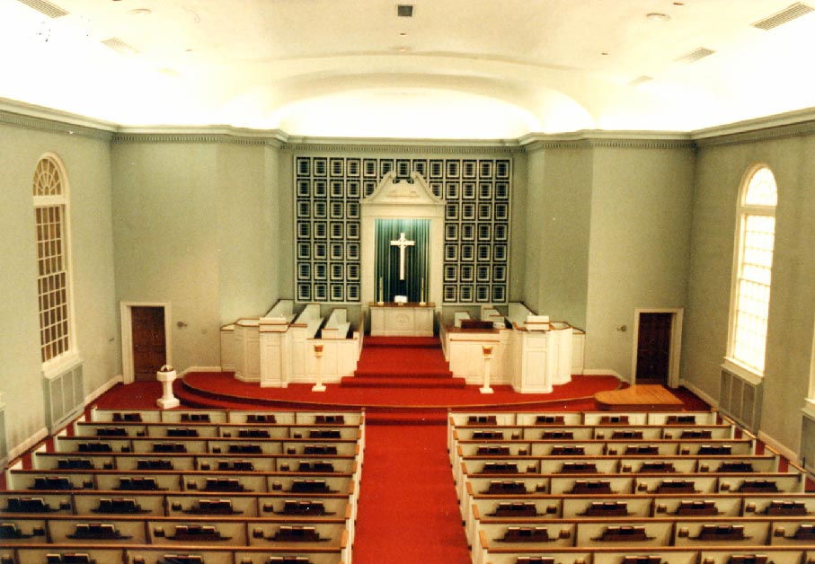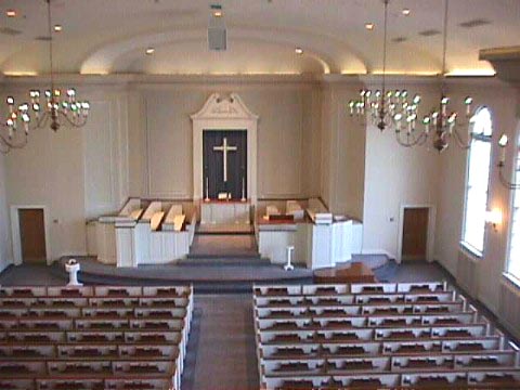 (Note: The Nave was changed to introduce the center aisle formation and the communion table and cloth backdrop.)