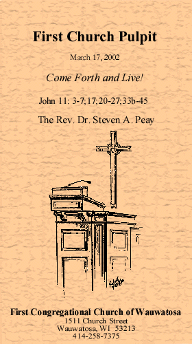For some odd reason I see parallels between the Scriptures we read today and that film. Ezekiel is called to prophesy over a valley of dry, bones, but they’re really living.  Jesus comes to the side of his sick friend who dies while he’s on the way to him.  These are scenes of helplessness and hopelessness.  Such scenes, however, are not confined only to the Bible.  A little over six months ago all of us watched, helpless, powerless, as the television cameras replayed the seemingly lazy flight of those two airliners into the World Trade Center.  When they replayed those images again and again the other day, I still felt the same frustration and helplessness.  In the time since, our news broadcasts have been filled with images of helplessness and hopelessness in Afghanistan and, now, in Israel and the West Bank.