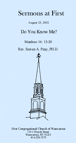While the goal of the commercial was to convince you that using this particular credit card put you in the same category as the celebrity, it unwittingly asked a far more profound question. Beneath the surface of that question are more questions -- questions of self-knowledge, of intimacy, and of perception. The philosopher Alan Watts once remarked that the most profound questions are often asked in ordinary conversation and language. "Who do you think you are? Who started this? Are we going to make it? . . . Is it serious?" {Alan Watts Beyond Theology: The Art of Godmanship, p. 29} "Do you know me?" is right up there, then, and we shouldn't be surprised that the exchange where Jesus asks this of his disciples constitutes the turning point for Matthew's Gospel and for Simon's life.