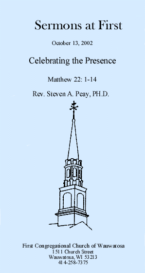 When we think of judgment – and this is the image that has been pushed – it’s a doom and gloom thing. However, this is not the image in the prophets or in this parable. The final reckoning is a banquet, a joyous party, a celebration of life in God’s presence. Jesus’ parable is designed to get us ready to accept the invitation. God, the king, flings open the doors of the banquet hall so that all may enter. However, only those who really want to be there, those who put on the wedding garments, are permitted to stay. It is not God who judges, then, but we ourselves as we choose to live in the presence or to pursue our own way.