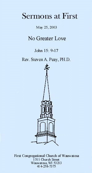 We pause this weekend to remember those who were willing to give “the last full measure,” not just for a cause, but for people. We can talk about causes and being willing to “die for the cause,” but when it comes right down to it, a cause is no more than the people who make it up. Kirk Straseskie didn’t ultimately die for the cause of freedom; he died reaching out to help others. He gave of the last full measure of himself so that four brother Marines might have the hope of life. Our national ideal, even our Christian faith is about people, it is about relationships. The love that Jesus teaches the disciples and John exhorts his church members to live out is at the core of our faith. God loves us; we love God, and then love others. No greater love is about relationship.