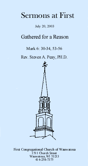Mark tells us that after the apostles had reported back to Jesus about their teaching and healing mission, “He said to them, ‘Come away to a deserted place all by yourselves and rest a while.’” That’s the other reason we gather. Our time of worship each week, our taking time for fellowship, perhaps sitting in on an adult education session, is our coming away to rest. Recall the definition we heard of a Congregational Church, a church is gathered for the public worship of God and for the mutual edification one of the other in the fellowship of the Lord Jesus.