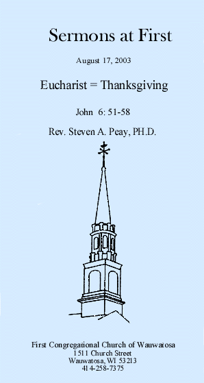 When Jesus began his discourseon the ‘bread of life’ he was, first of all, breaking the bread of wisdomfor his hearers. Over and over in that section of John’s Gospel Jesus talksabout God as the source of life, of nourishment, fulfillment, and growth. Thenew manna that we’re to “munch” – and that is the literal translation ofthe Greek word for ‘eat’ used here – is to be the “flesh and blood” ofJesus. “Flesh and blood” denotes wholeness, completeness, and what Jesus isinviting us to do is to enter into the fullness of Divine life revealed in hisperson, his teaching, and his work.